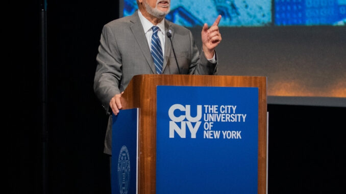 He began his speech, “I was president of Hostos for five years, so this feels like a homecoming for me. Here, I learned so much about leadership, but above all, I was left with a deep belief in CUNY’s mission, so I’m deeply honored to bring our State of the University to this wonderful campus.”