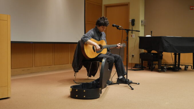 Several students took to the stage with their guitars and voices. Attendees sang original songs, nervous at first as they tuned their guitars. As they performed, a level of comfort was reached by the artist. As soon as they strummed their last note, the artist was met with loud cheers and applause. Adding onto the idea of “open mic”, where anyone can perform their own original works.