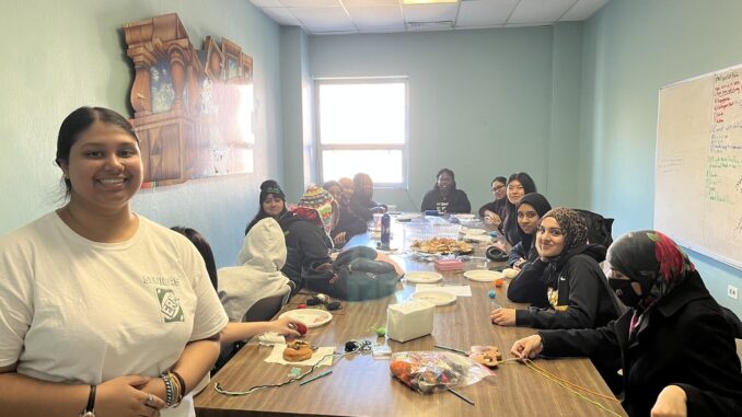 The long table, which had just enough seats for all the attendees, was filled with beads of various colors, rolls of yarn and strings, and a tray of sweets in the middle. With materials galore and assistance from E-Board members, club President Aaliyah Martin says creating a safe space to cool off during testing season is the most crucial aspect of this event.