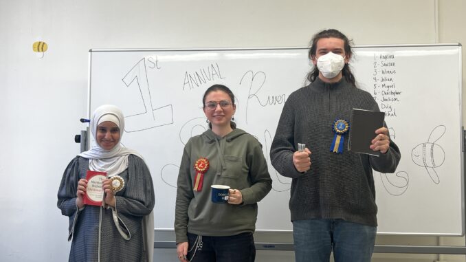 Sawsan came in third place and received a Merriam-Webster dictionary. Lambros came in second and was given a mug that read “doing my bee,” to remain on-theme for the spelling bee. Figueroa won the first-place prize, which was a notebook and a set of pens. Each winner was also given a ribbon corresponding to their placement.